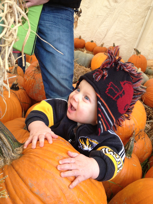 I've missed the days of heading to the Pumpkin Patch, browsing through the fields for that perfect pumpkin. I have to admit when we found out we were having a little one I kept thinking about our future trips to the Pumpkin Patch. John, My parents and me decided to take Sawyer to Campbell's Maze Daze in Clever last weekend for his first experience. I was a little saddened you don't actually go out and pick your pumpkin like I remembered but they still had a lot to do. They offered hayrides, a corn maze, horse rides, pumpkin painting, train rides and animals. He still really enjoyed it but I think next year will be even better since he will be able to do more. We still picked out a couple pumpkins, they just were already picked and under a tent, oh well!